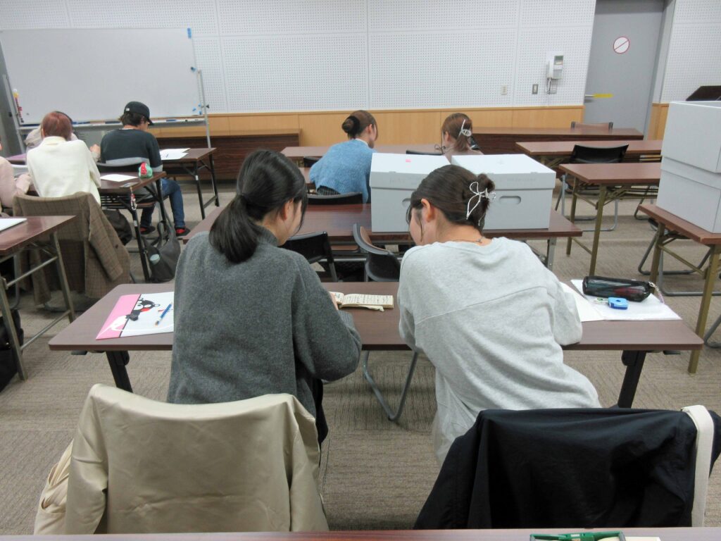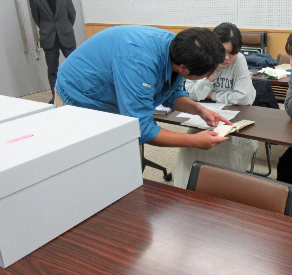 授業「複合演習Ⅳ」(2025年度後期:大島明秀、真島望担当)では、実物の和本を用いた書誌学の授業を行っていますが、授業で学んだ成果を発揮する機会として、11月16日に熊本博物館で学外実習を行い、学生13名とともに同館が所蔵する未整理和本の整理に取り組みました。 和本書誌学実習は今後も熊本博物館との連携事業として継続する予定で、来年度も授業「複合演習Ⅱ」の中で行うことを考えています。 カテゴリ 地域文献・史跡調査 この記事をシェアする