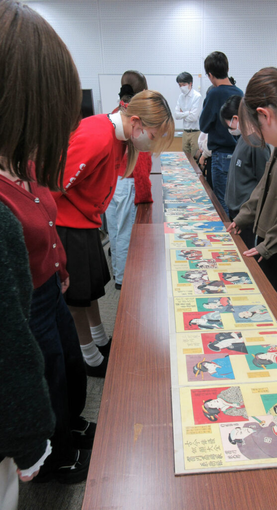 授業「複合演習Ⅳ」(2025年度後期:大島明秀、真島望担当)では、実物の和本を用いた書誌学の授業を行っていますが、授業で学んだ成果を発揮する機会として、12月21日に熊本博物館で学外実習を行い、学生13名とともに同館が所蔵する未整理和本の整理に取り組みました。中でも全長数メートルに及ぶ浮世絵・引札の貼り交ぜ帳を広げた際は圧巻で、学生たちもそれぞれの着眼点で、食い入るように熱心に眺めていました。